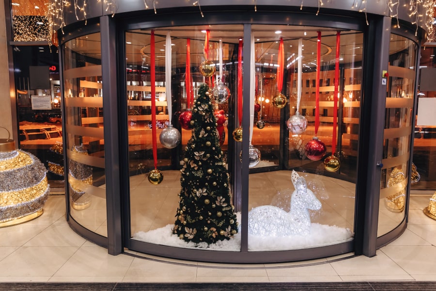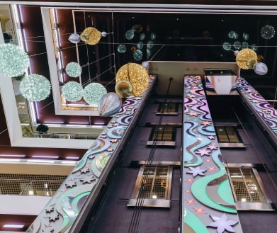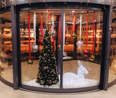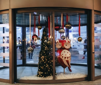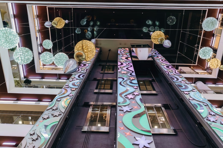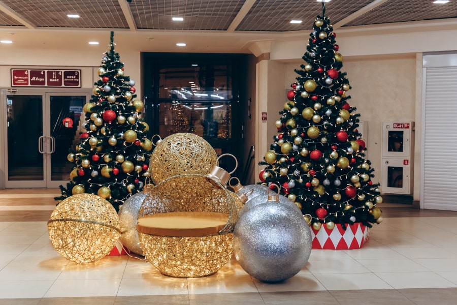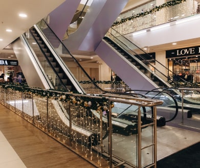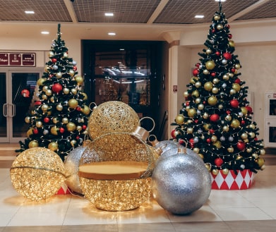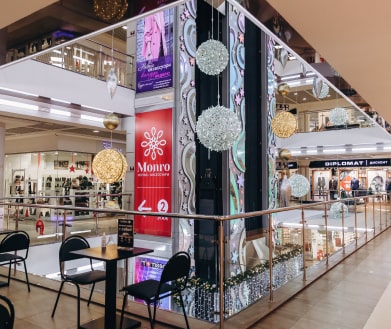Новогодняя концепция «Игра света», где каждый элемент поддерживает единый стиль оформления. В основе концепции лежит идея создания легкой и воздушной атмосферы, которая воплощается с помощью легких подвесных шаров и световых арт-объектов. Характерные элементы декора позволили превратить пространство торгового центра в настоящую игру света.